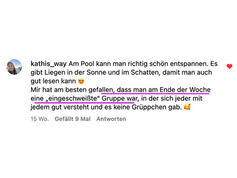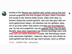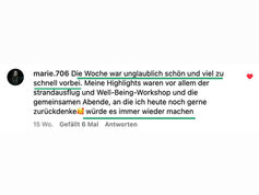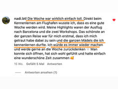 "Es gibt Partyreisen nach Lloret, Surfcamps oder Jugendzeltlager... das war nie so meins und mir hat immer etwas gefehlt. Ich wollte allein verreisen, aber nicht allein sein und nicht alles allein planen. Ich wollte gern einen Safe Space mit Frauen, in dem ich mich wohl fühlen kann und genau das hat Miss Aliana Trips mit den Girlstrip-Retreats geschaffen". (Teilnehmerin aus dem ersten Girlstrip-Retreat vor einigen Jahren)